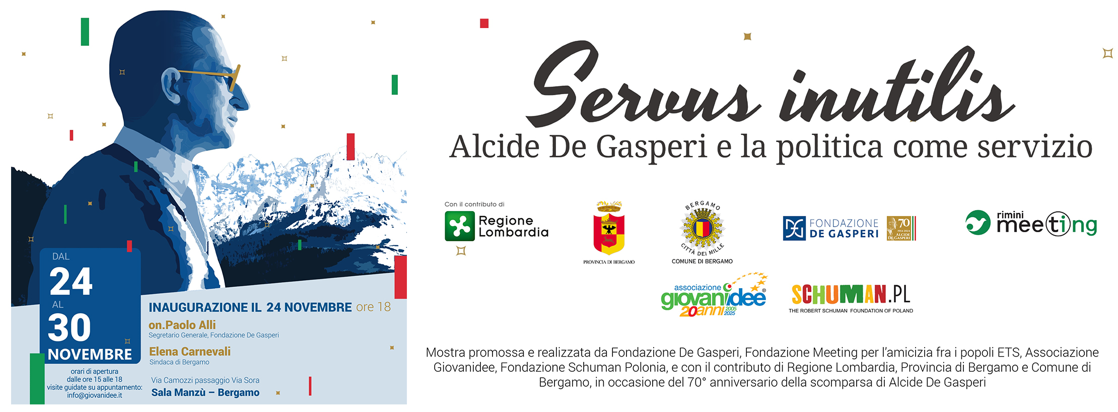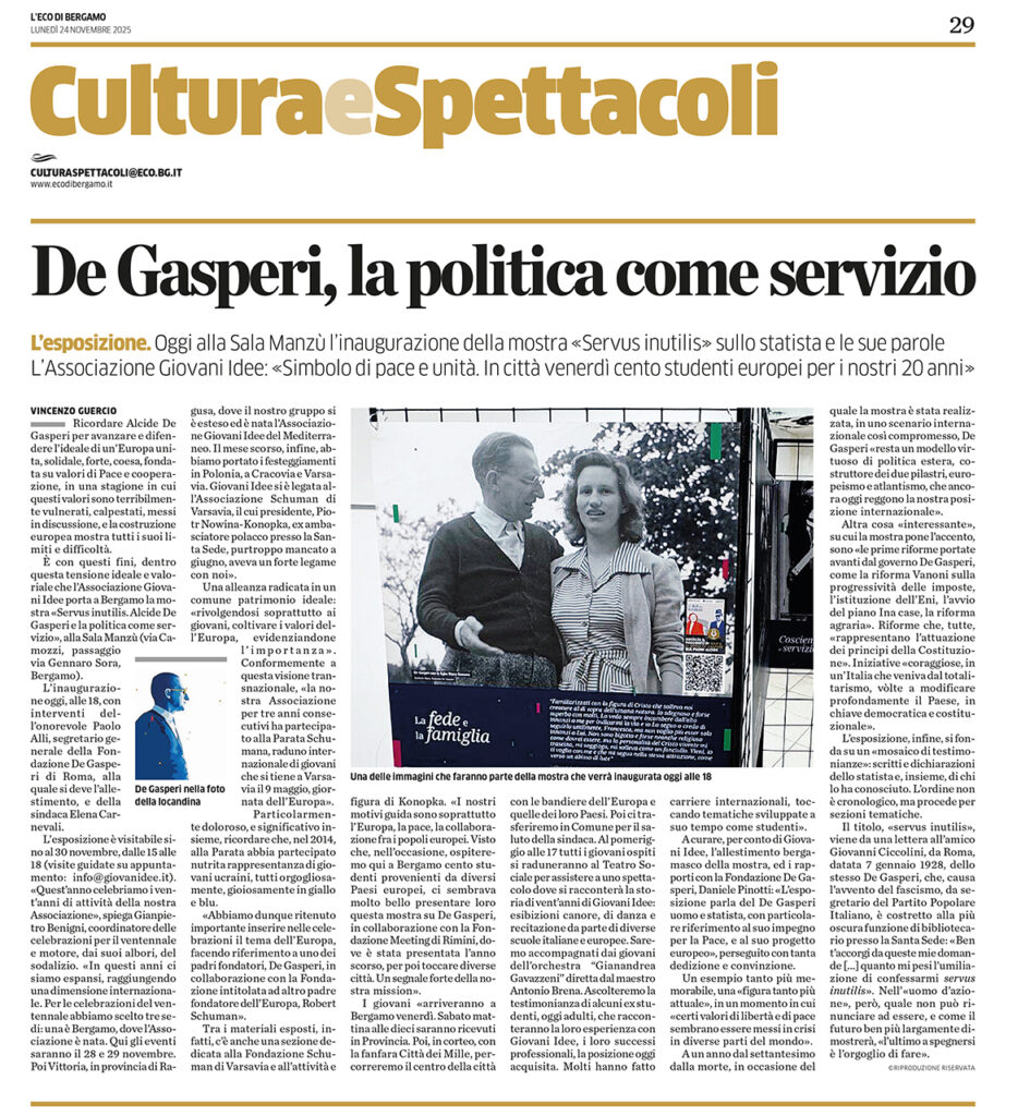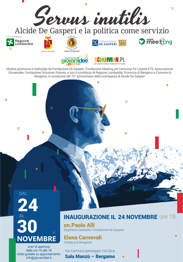 È con questi fini, dentro questa tensione ideale e valoriale che l’Associazione Giovani Idee porta a Bergamo la mostra <<Servus inutilis. Alcide De Gasperi e la politica come servizio», alla Sala Manzù (via Camozzi, passaggio via Gennaro Sora, Bergamo).
